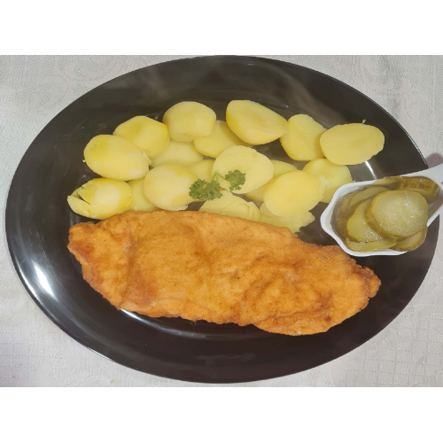 10. Vyprážaný kurací rezeň, varené zemiaky , kyslá uhorka ( 120/250/30)g – 1,3,7